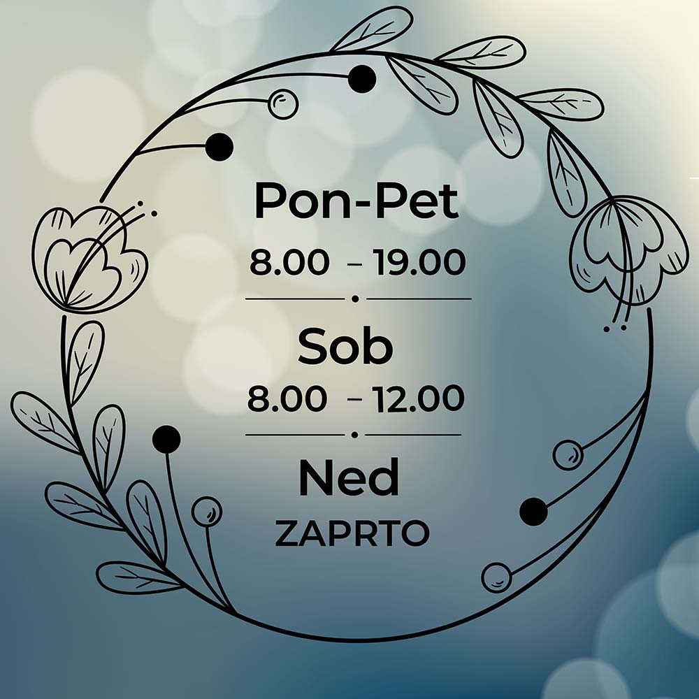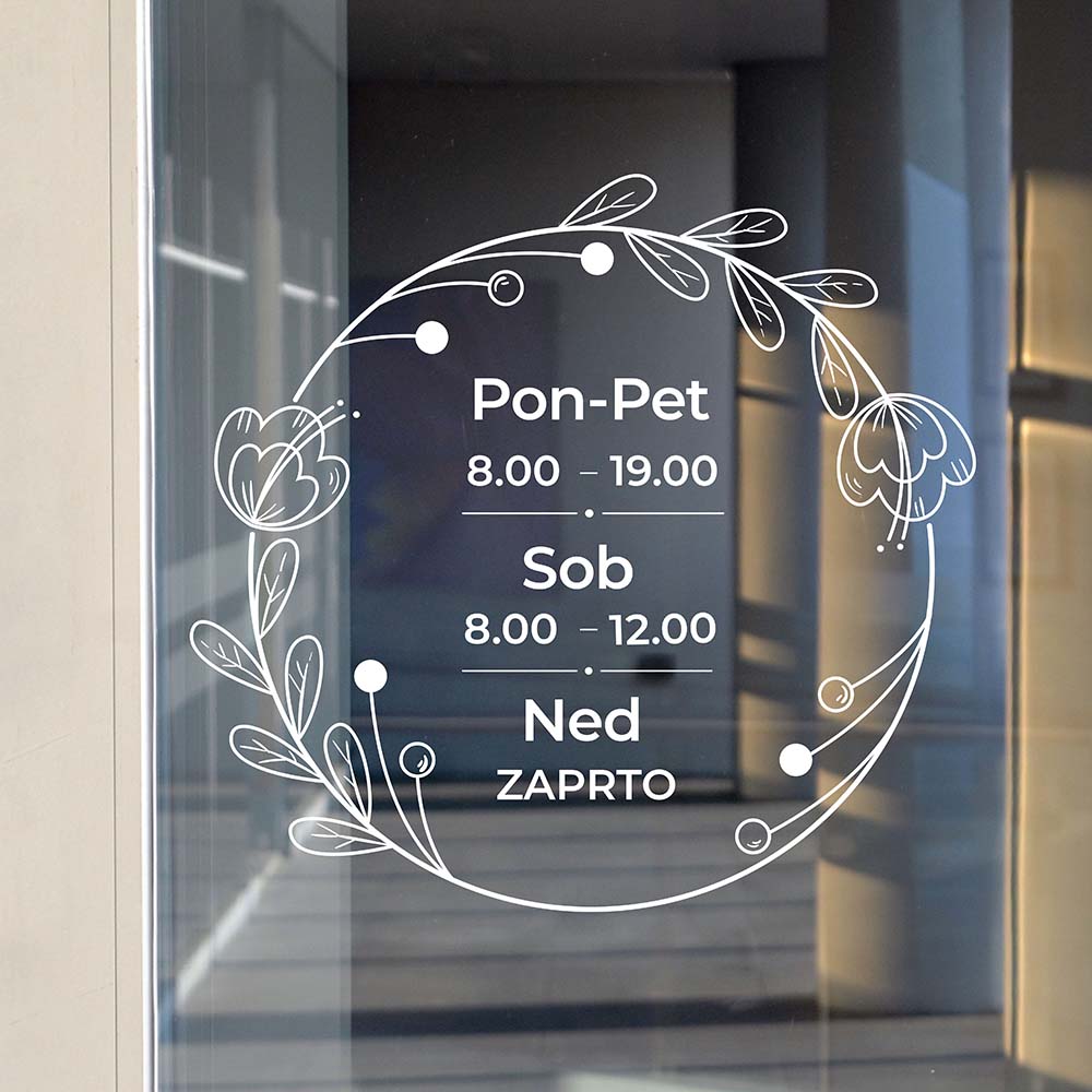 Nalepka za označevanje delovnega časa. Namestite jo lahko na steklo ali drugo gladko površino. Vnesite želen tekst, ki ga želite imeti zapisanega v sredini – delovni čas, lahko tudi telefonsko število ali drugo. Po namestitvi na steklu ali steni ostane samo motiv oz. črke. Enostavna namestitev in čudovit unikaten izgled.