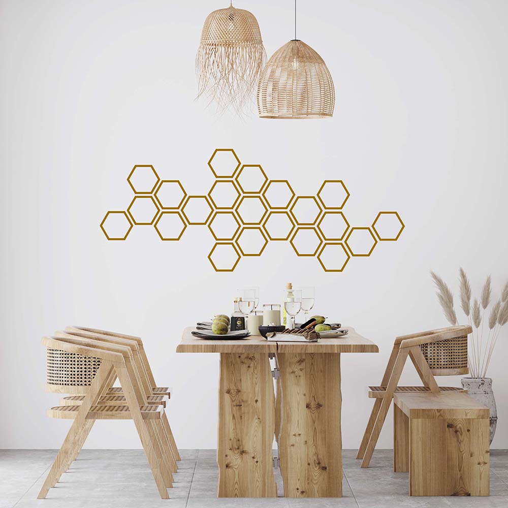 Stenske nalepke satovja popularne v sodobnem designu prostora. Izdelamo jih iz mikronsko tanke WallArt folije. Poleg barve lahko izbirate med tremi velikostmi satovja.